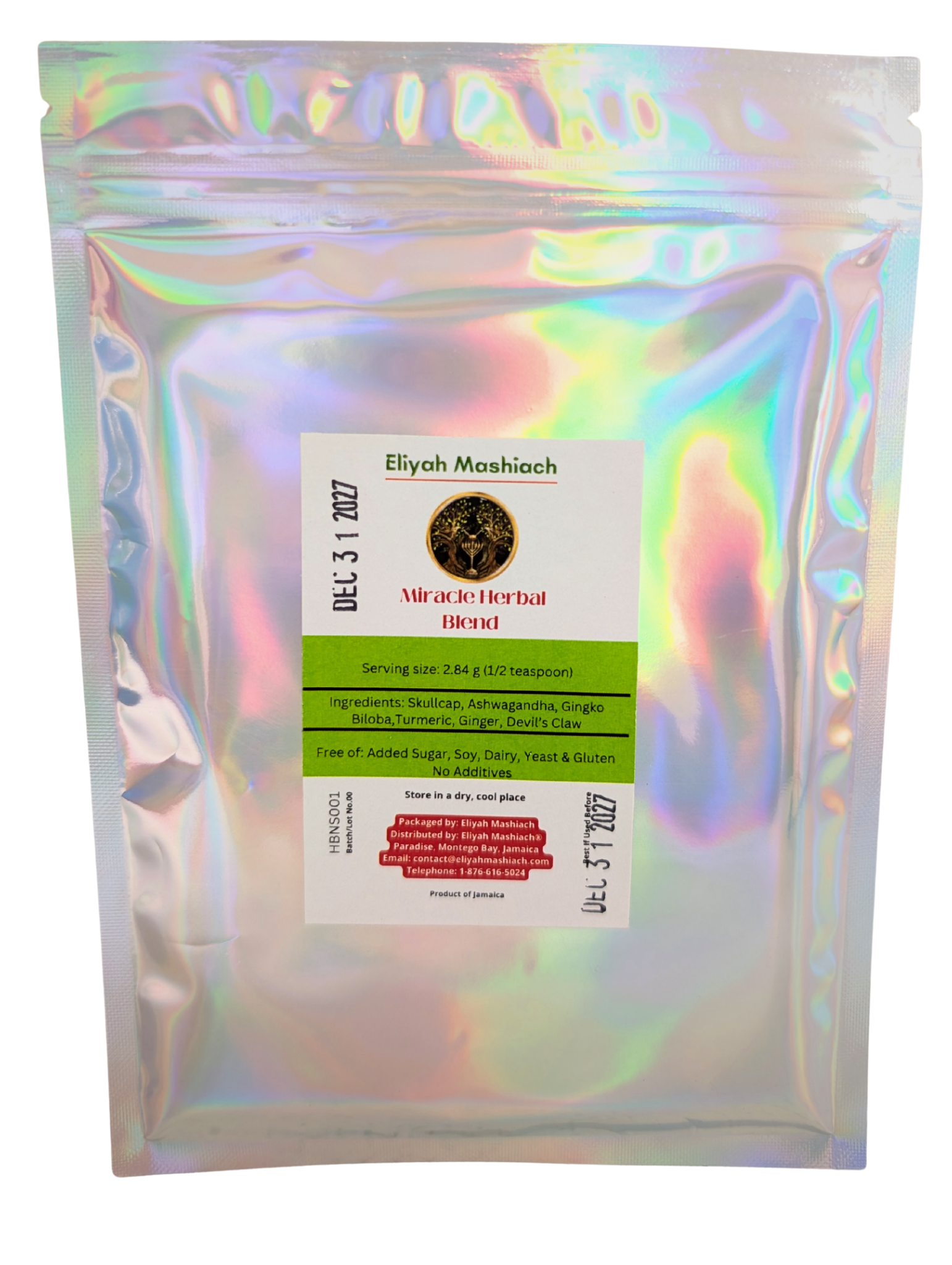 Eliyah Mashiach NS-Powder is made with : Skullcap, Ashwagandha, Ginkgo Biloba, Turmeric, Ginger, and Devil's Claw.